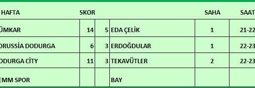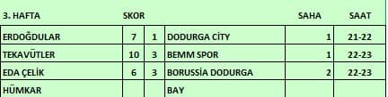 2019-2020 Hasan Hüseyin KAŞIKÇI Futbol Turnuvası üçüncü hafta sonuçları, puan durumu ve dördüncü hafta fikstürü aşağıdadır. Şimdiden herkese başarılar.